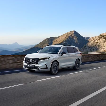 Voiture SUV hybride CR-V roulant sur une route de montagne.