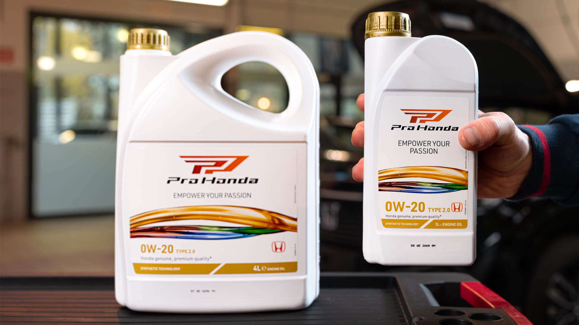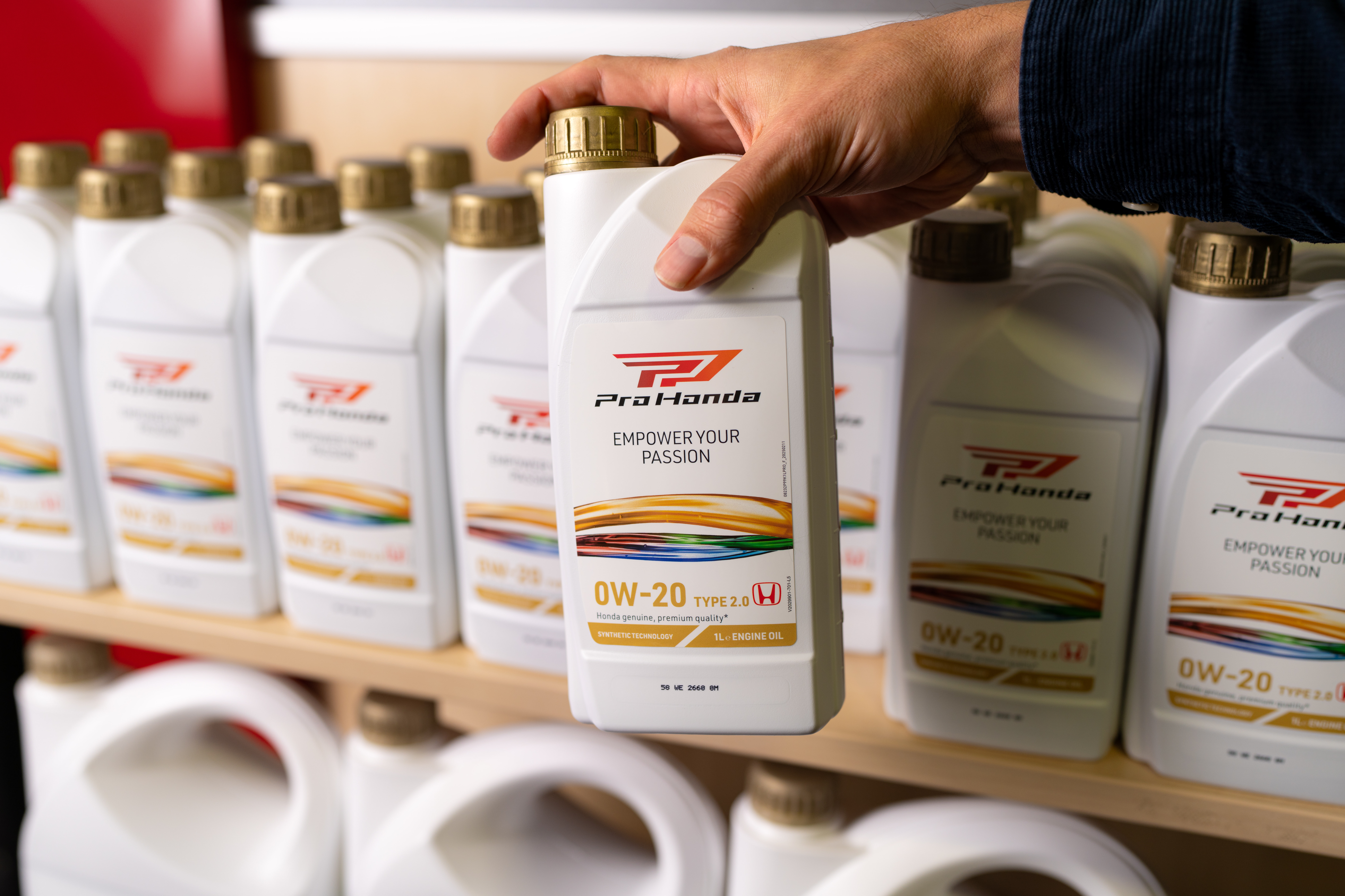 Two containers of Pro Honda 0W-20 engine oil, one large 4-liter jug and one smaller 1-liter bottle, displayed on a counter in an automotive shop setting. A hand holding a white plastic bottle of Pro Honda 0W-20 Type 2.0 engine oil. The bottle features the Pro Honda logo and the slogan \"EMPOWER YOUR PASSION\". The gold cap and colorful design elements are visible on the product label.